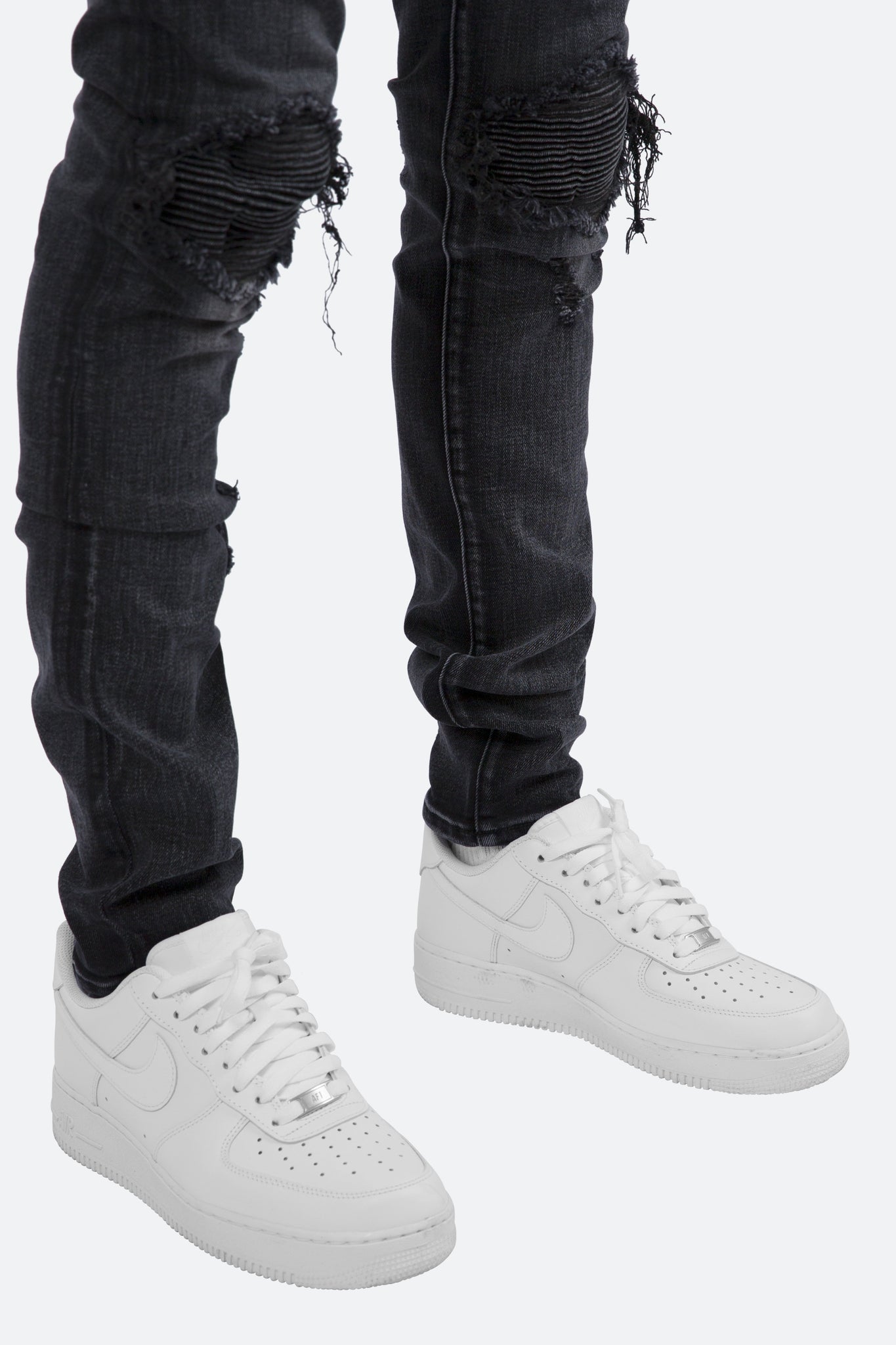 the X162 Stretch Denim is designed with our new X fit which is skinny throughout with an extended inseam for stacking, and features a vintage wash, distressing throughout and finished with pin-tucked denim panels repairing the knee holes.