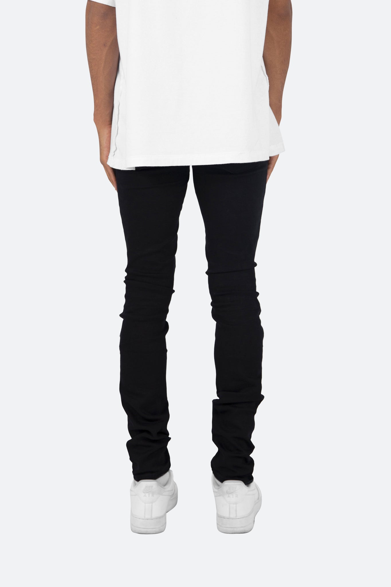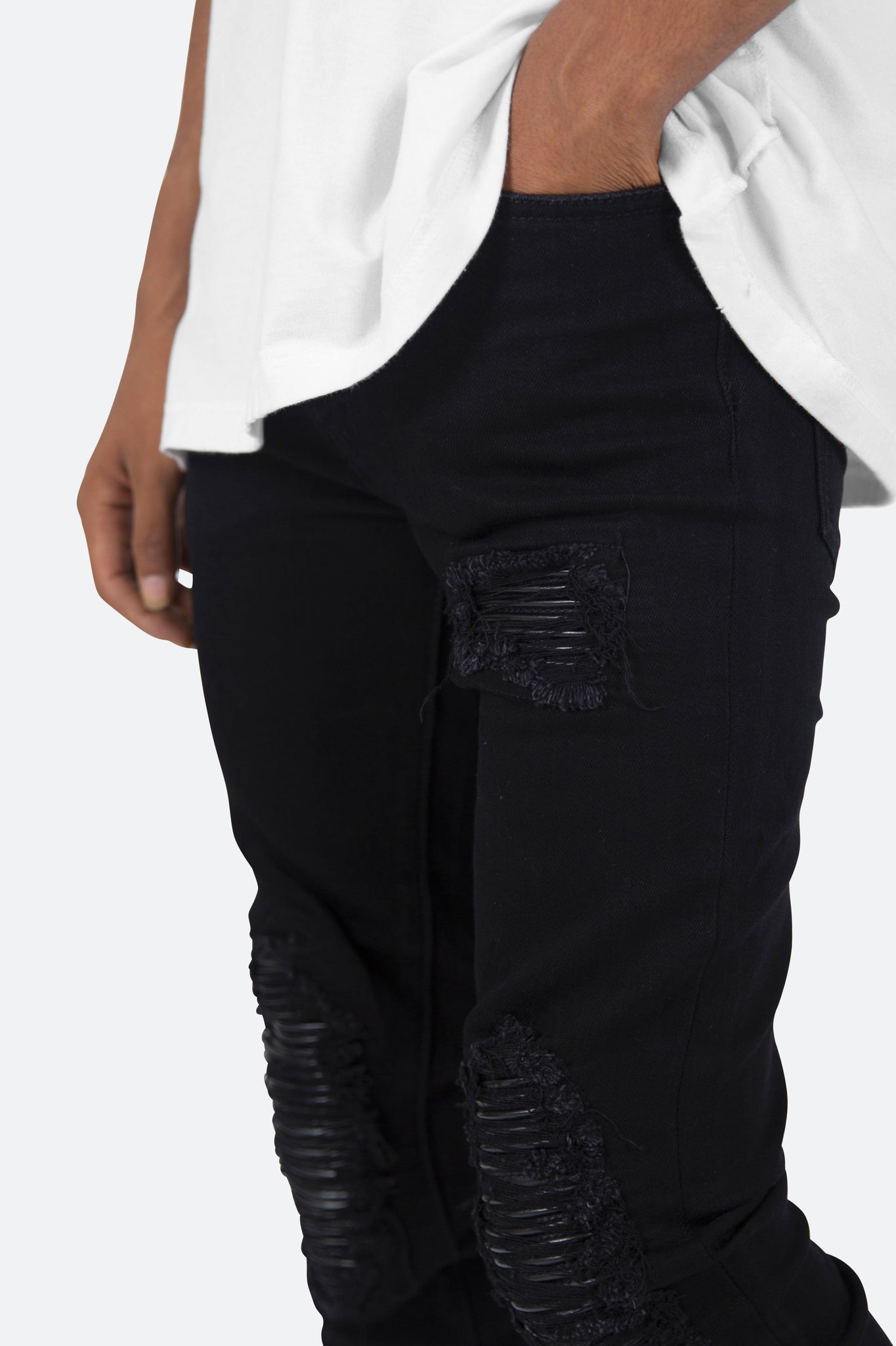 the X203 Stretch Denim is designed with our new X fit which is  skinny throughout with an extended inseam for stacking, and features a  distressing throughout and finished with pin-tucked poly-leather panels repairing the holes at the knees and thigh.
