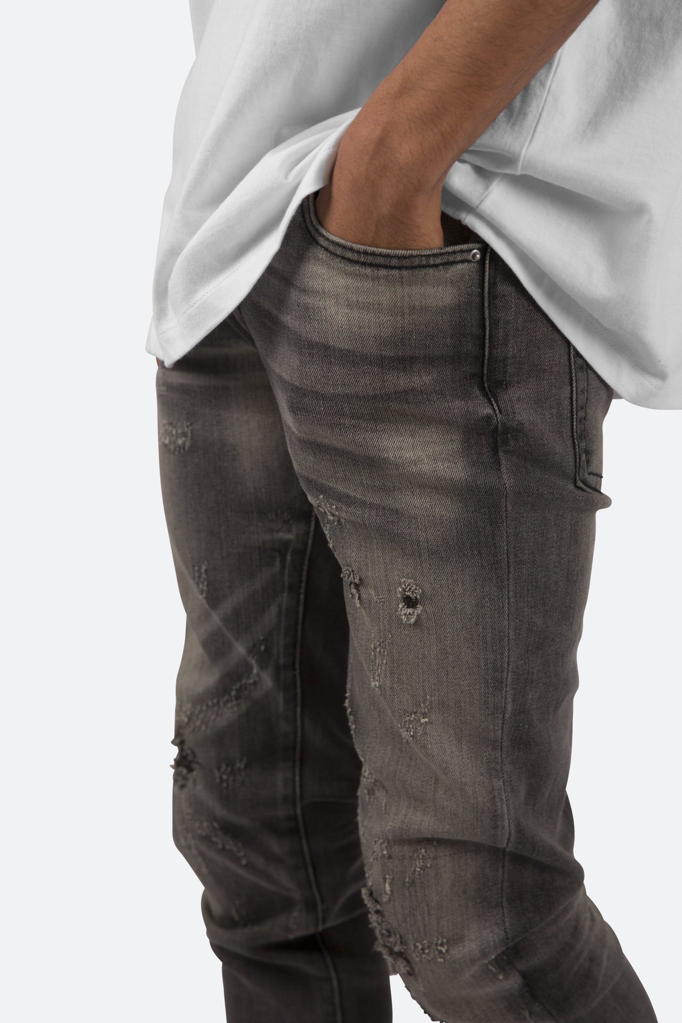 the X145 Stretch Denim is designed with our X fit which is skinny throughout with an extended inseam for stacking, and features a vintage grey wash and custom distressing throughout.