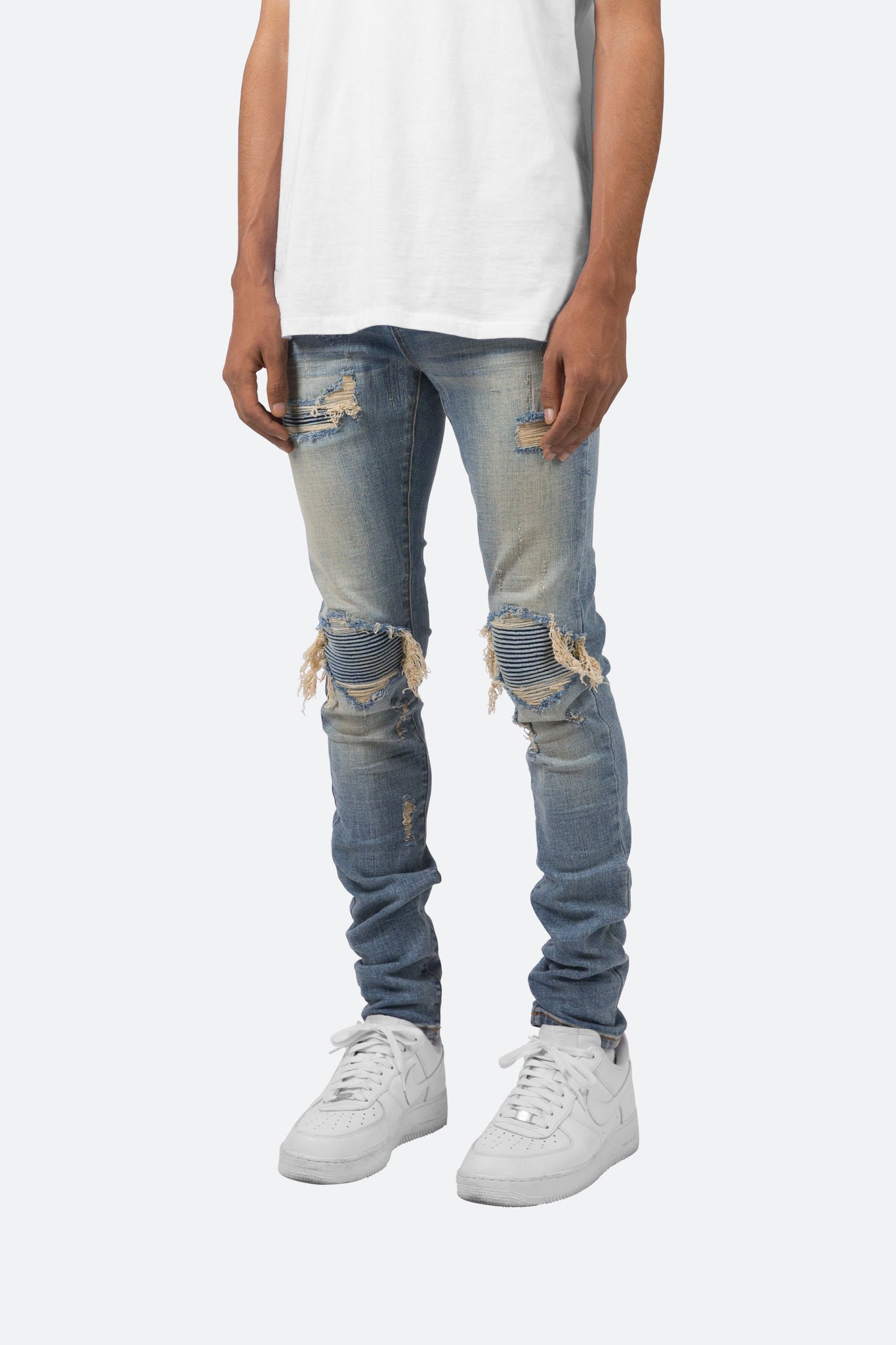 the X162 Stretch Denim is designed with our new X fit which is  skinny throughout with an extended inseam for stacking, and features a medium wash, distressing throughout and finished with pin-tucked denim panels repairing the knee holes.