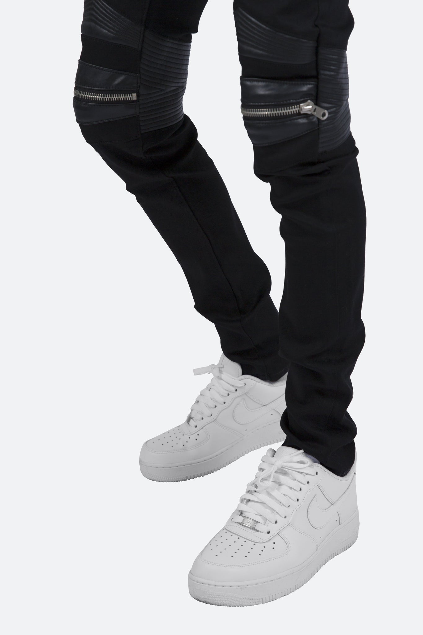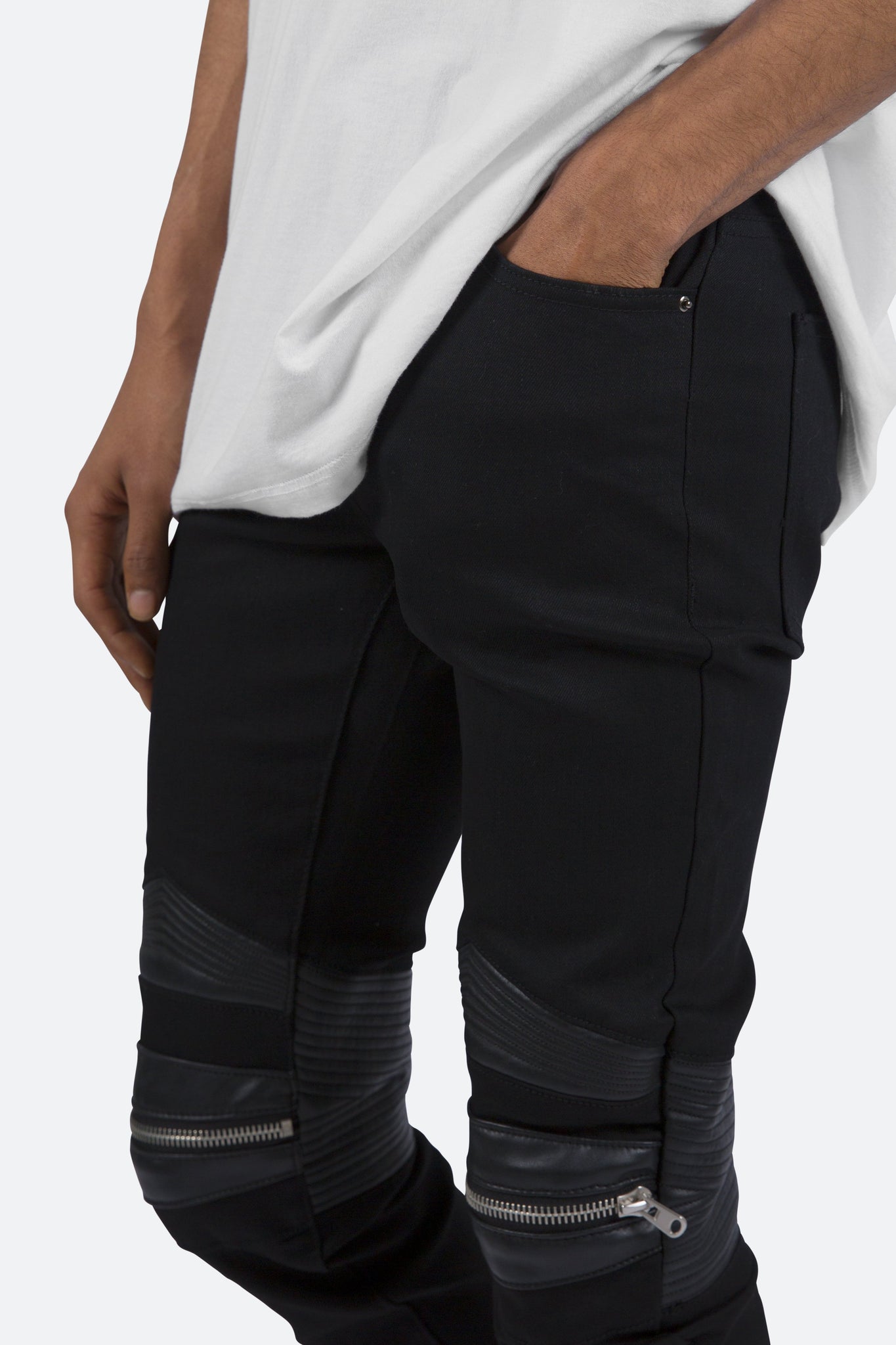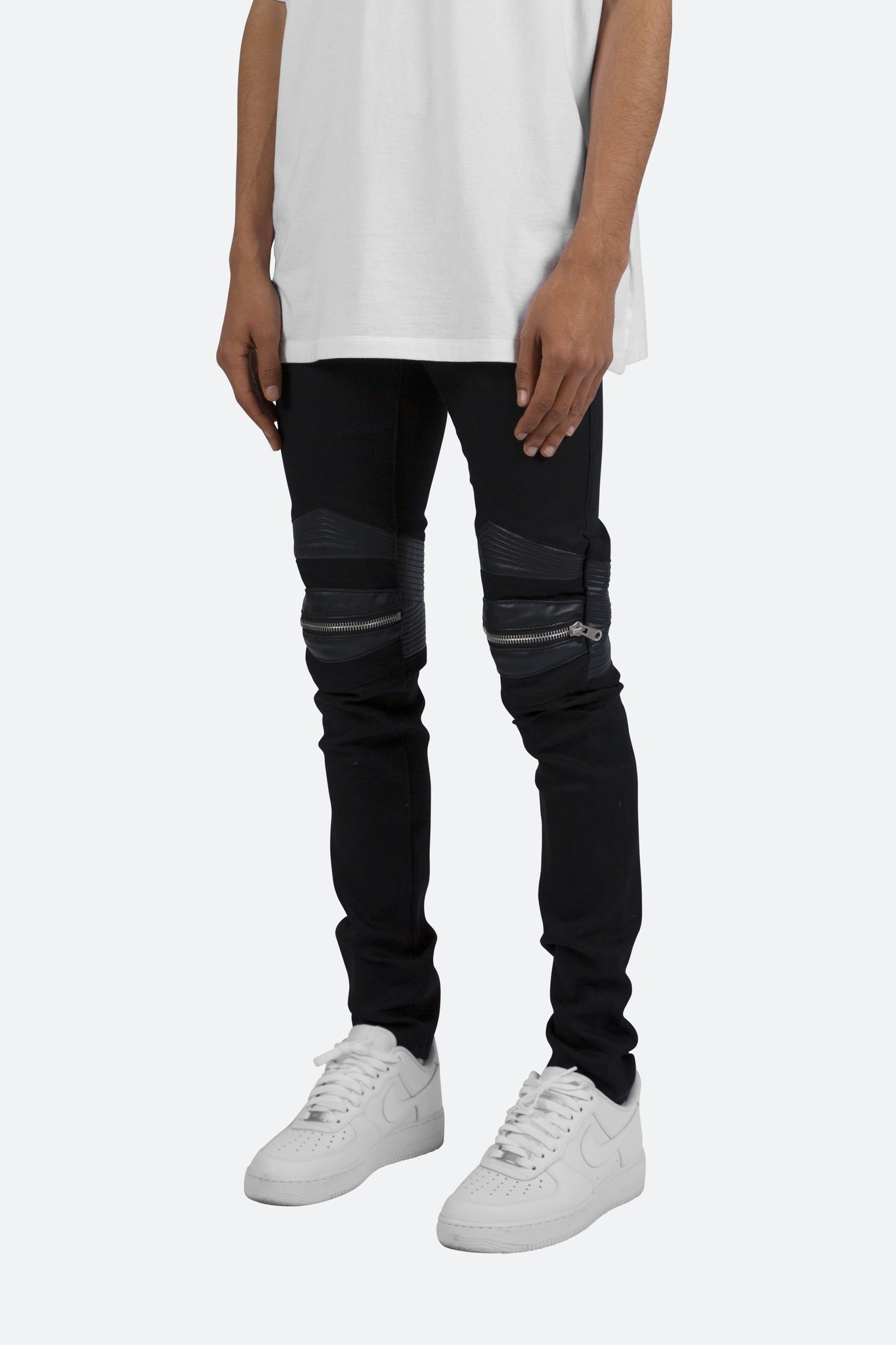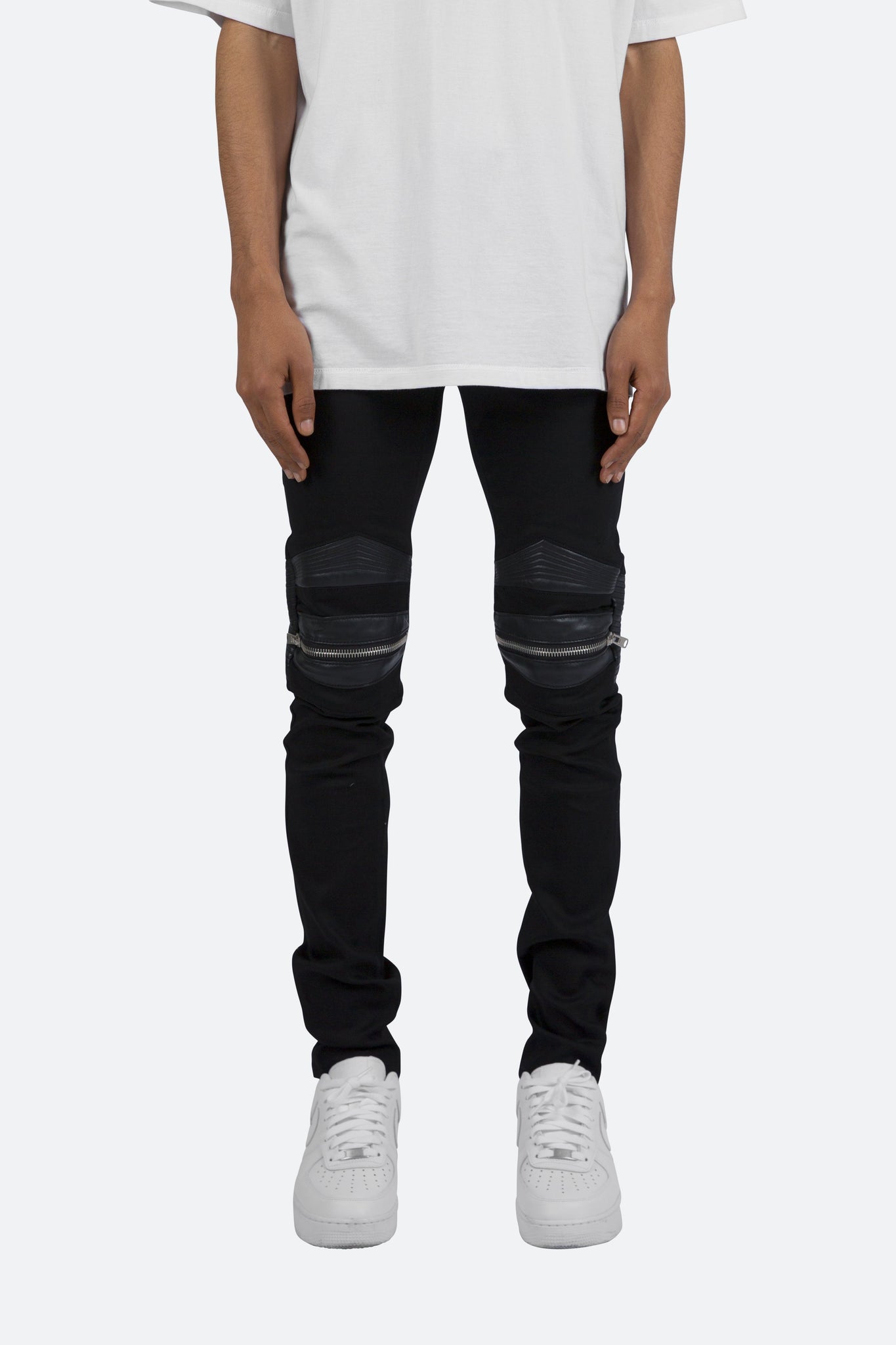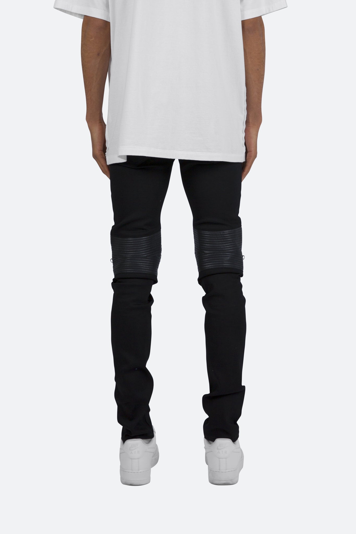 the X186 Stretch Denim is designed with our new X fit which is skinny throughout with an extended inseam for stacking, and features black denim, poly-leather moto details at the knees, and finished with zipper details at the knees.